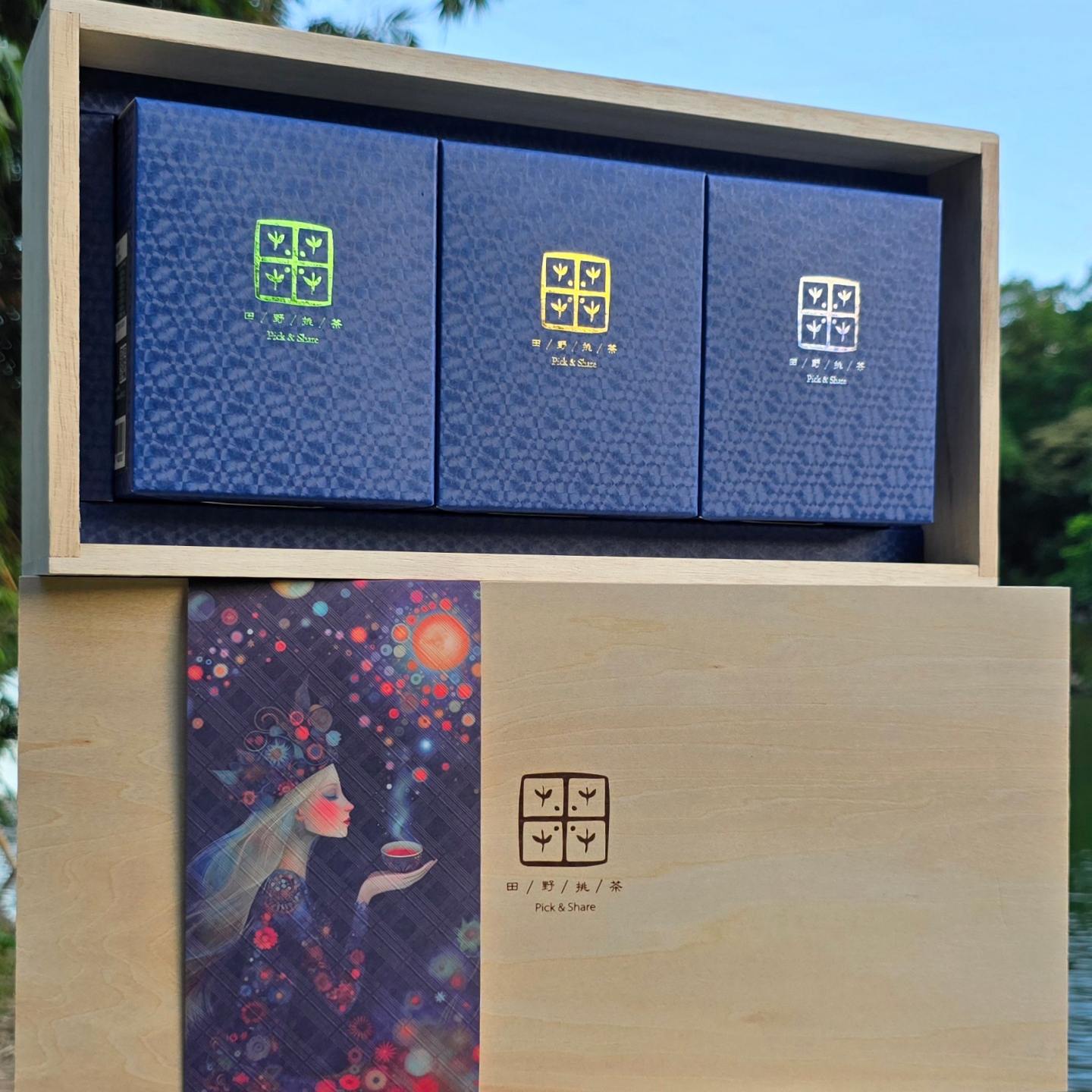 櫸木盒裝,附不織布提袋,一盒可裝茶禮3入(共18包)。
